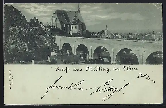 Mondschein-AK Mödling bei Wien, Kirche und Viadukt