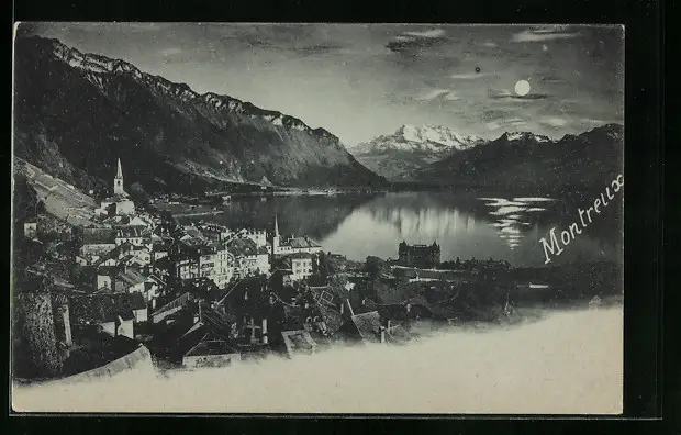 Mondschein-AK Montreux, Uferpartie mit Kirche