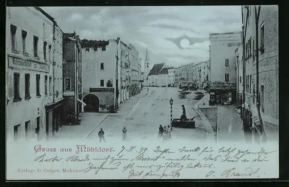 Mondschein-AK Mühldorf, Strassenpartie gegen Kirche