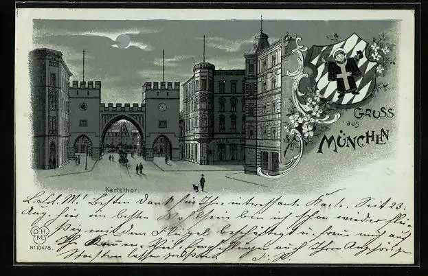 Mondschein-AK München, Partie am Karlstor, Wappen