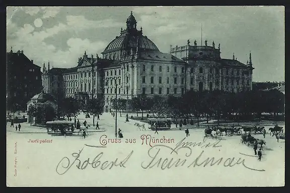 Mondschein-AK München, Pferdebahnen vor dem Justizpalast