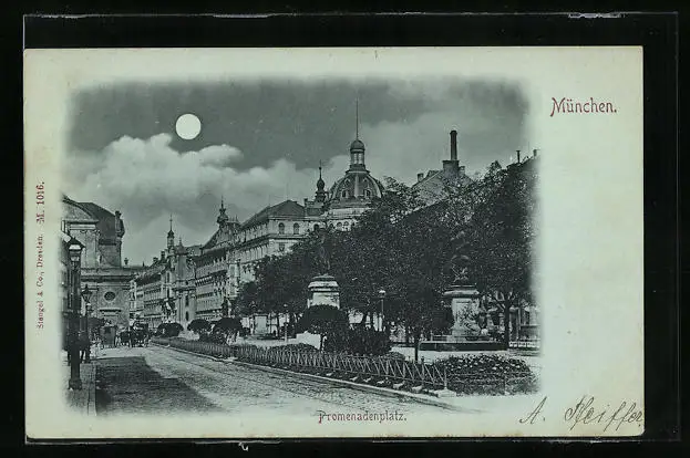 Mondschein-AK München, Strassenpartie am Promenadenplatz