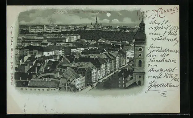 Mondschein-AK München, Totalansicht vom Peterskirchthurm