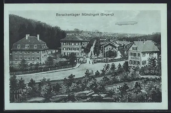 Mondschein-AK Münsingen, Zeppelin über dem Barackenlager