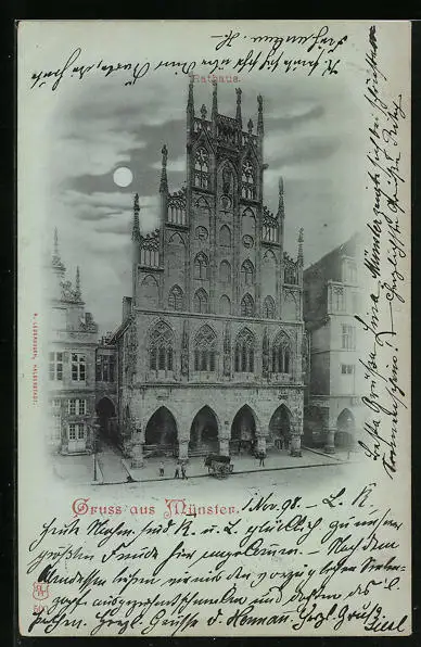 Mondschein-AK Münster, Rathaus mit Vorplatz