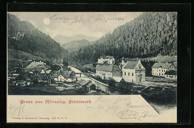 Mondschein-AK Mürzsteg, Gruss mit der Mürz und Kirche