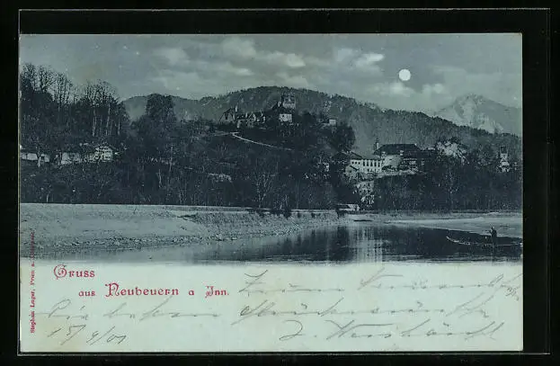 Mondschein-AK Neubeuern a. Inn, Ortsansicht mit Bergpanorama