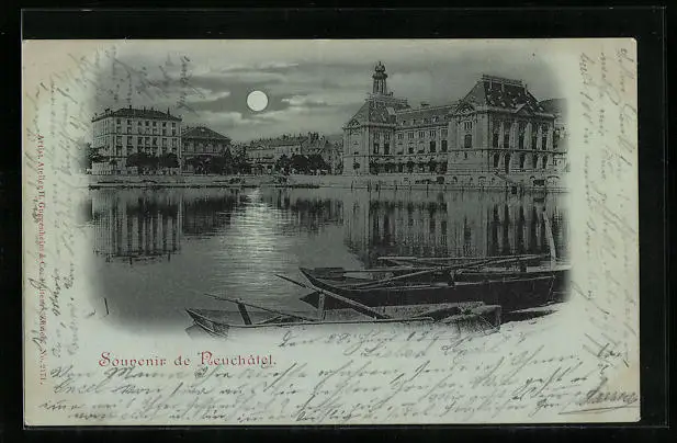 Mondschein-AK Neuchâtel, Uferpartie mit Booten