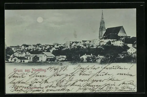 Mondschein-AK Neuötting, Teilansicht mit Kirche