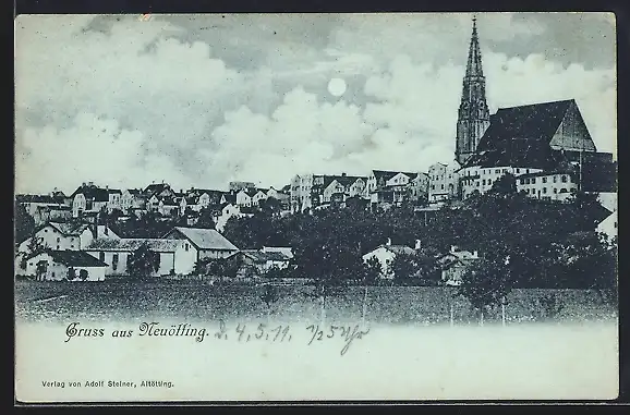 Mondschein-AK Neuötting, Teilansicht mit Kirche