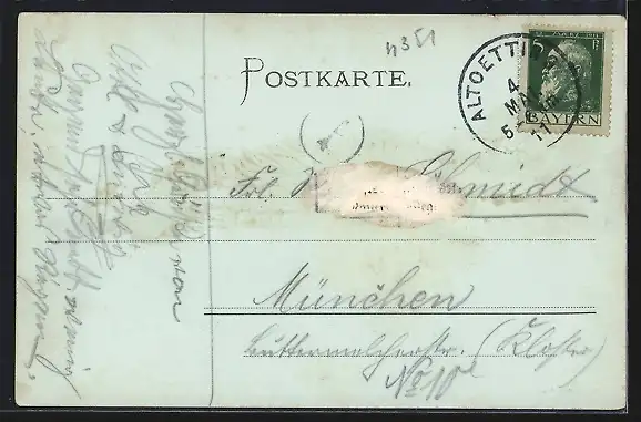alte Ansichtskarte, gelaufen 1911, rückseitig Klebe- und Papierreste, guter Zustand