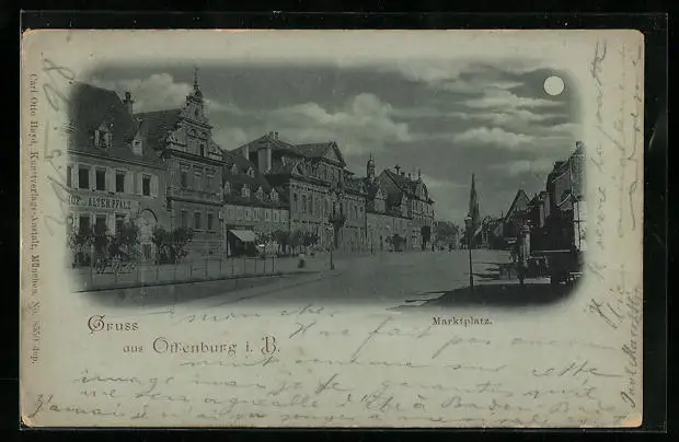 Mondschein-AK Offenburg i. B., Marktplatz im Vollmondlicht
