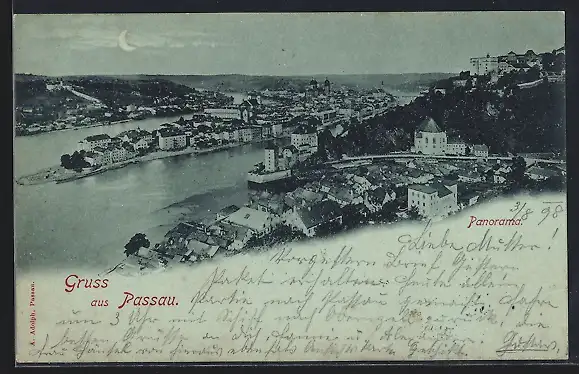 Mondschein-AK Passau, Panoramablick über die Stadt am Fluss