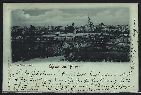 Mondschein-AK Pilsen, Panorama mit Kirche