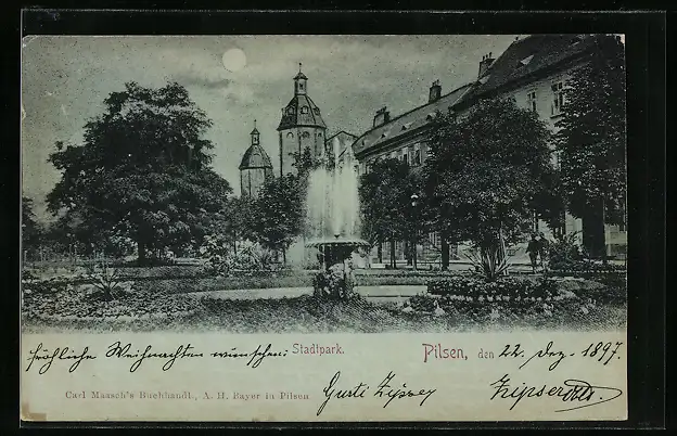 Mondschein-AK Pilsen, Stadtpark, Springbrunnen