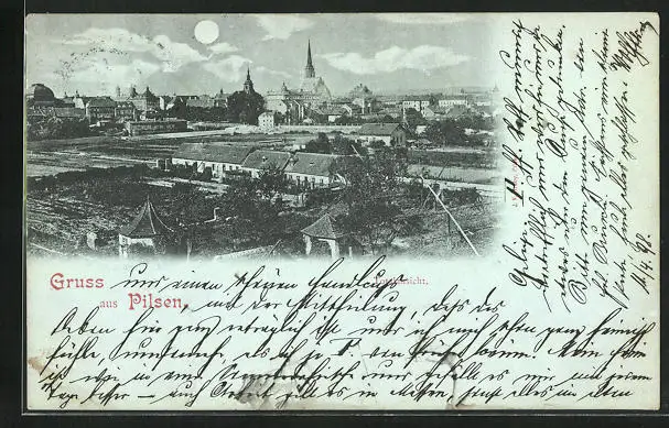 Mondschein-AK Pilsen, Totalansicht mit Kirche