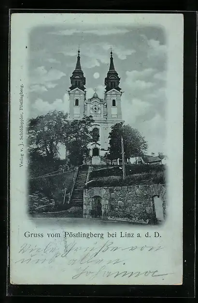 Mondschein-AK Pöstlingberg bei Linz, Vorderansicht der Kirche