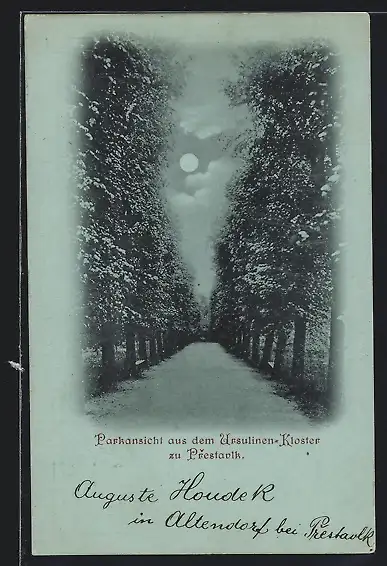 Mondschein-AK Prestavlk, Parkansicht aus dem Ursulinen-Kloster