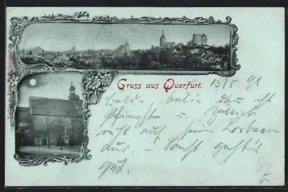 Mondschein-AK Querfurt, Ortsansicht mit Kirche