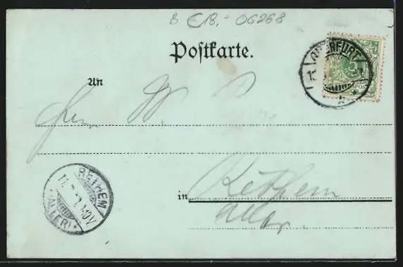 Personenbezogene Daten auf der Rückseite der Karte wurden durch blauen Textmarker unkenntlich gemacht. Die blauen Stellen sind auf die Vorderseite durchgeweicht und wirken sich negativ auf das Postkartenfoto aus