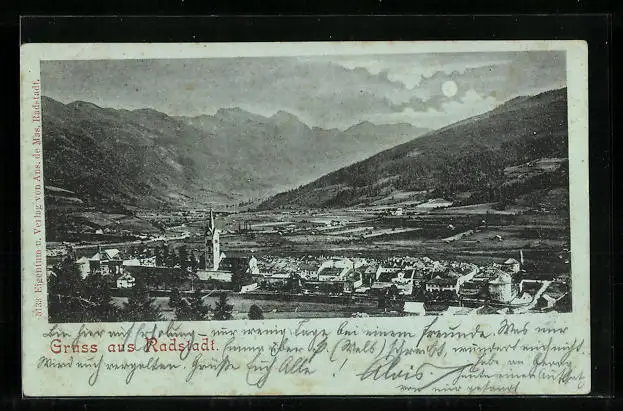 Mondschein-AK Radstadt, Ortsansicht mit Kirche