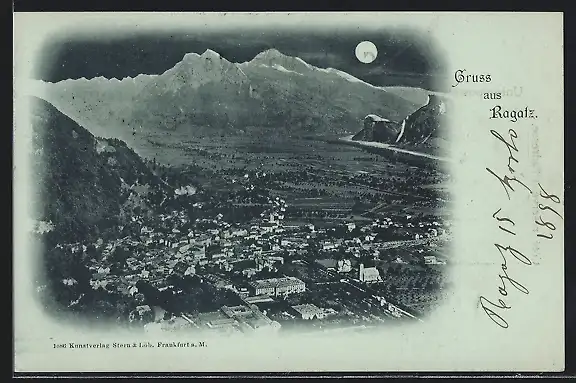 Mondschein-AK Ragatz, Teilansicht mit Bergen