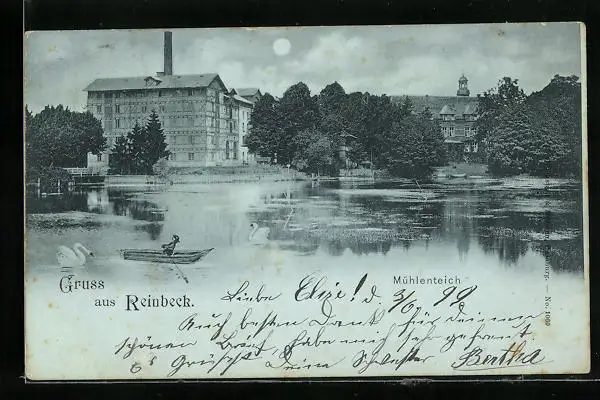 Mondschein-AK Reinbeck, Mühlenteich mit Boot