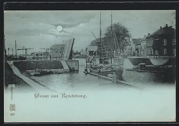 Mondschein-AK Rendsburg, Hafen mit Zugbrücke