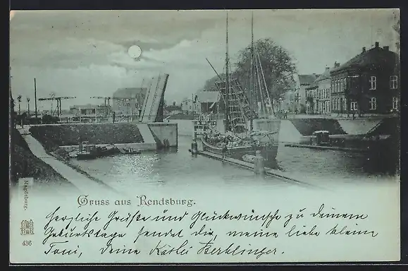 Mondschein-AK Rendsburg, Uferpartie mit Segelboot