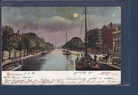 Mondschein AK Rotterdam Schiekade, gelaufen von 1907, leider wurde die Briefmarke entfernt.