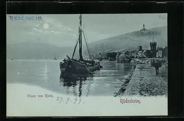 Mondschein-AK Rüdesheim, Gruss aus der Stadt am Rhein