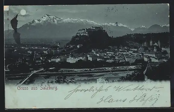 Mondschein-AK Salzburg, Ortsansicht mit Burg und Gipfelpanorama