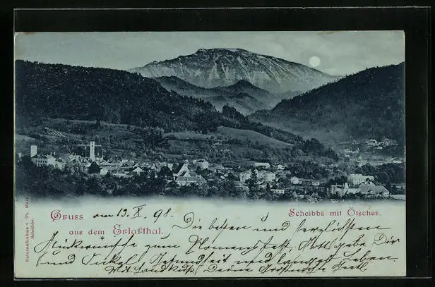 Mondschein-AK Scheibbs, Ortsansicht mit Ötscher