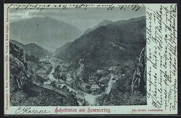 Mondschein-AK Schottwien am Semmering, Ortsansicht aus der Vogelschau