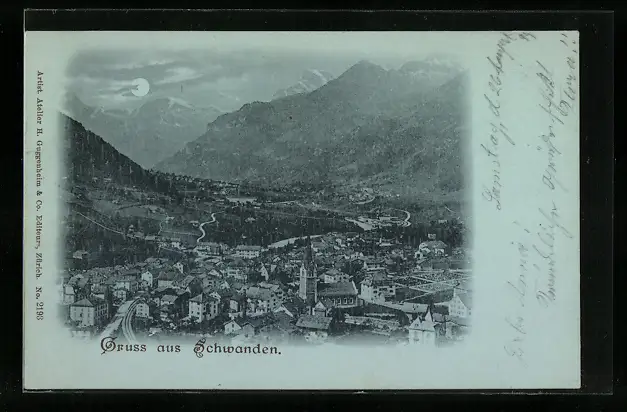 Mondschein-AK Schwanden, Gesamtansicht aus der Vogelschau