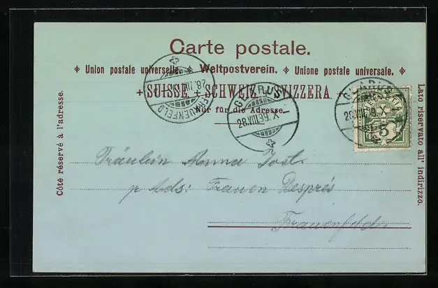 Personenbezogene Daten auf der Rückseite der Karte wurden durch blauen Textmarker unkenntlich gemacht. Die blauen Stellen sind auf die Vorderseite durchgeweicht und wirken sich negativ auf das Postkartenfoto aus