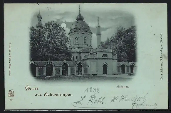 Mondschein-AK Schwetzingen, Ansicht der Moschee