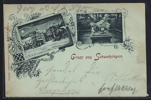 Mondschein-AK Schwetzingen, Strassenpartie im Schnee, Ziegenstatue