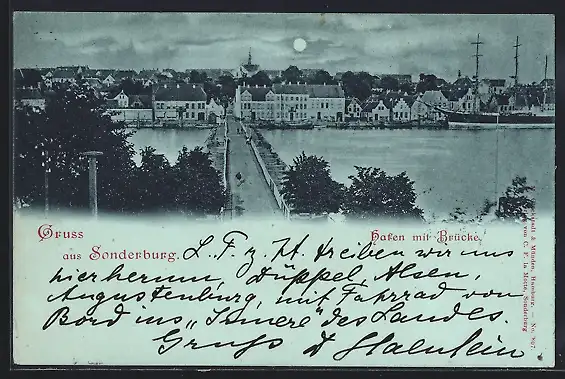 Mondschein-AK Sonderburg, Hafen mit Brücke