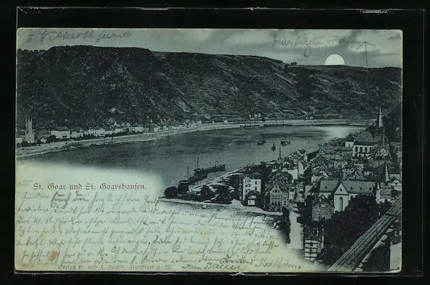 Mondschein-AK St. Goar bei St. Goarshausen, Ortsansicht aus der Vogelschau