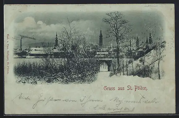 Mondschein-AK St. Pölten, Teilansicht im Schnee