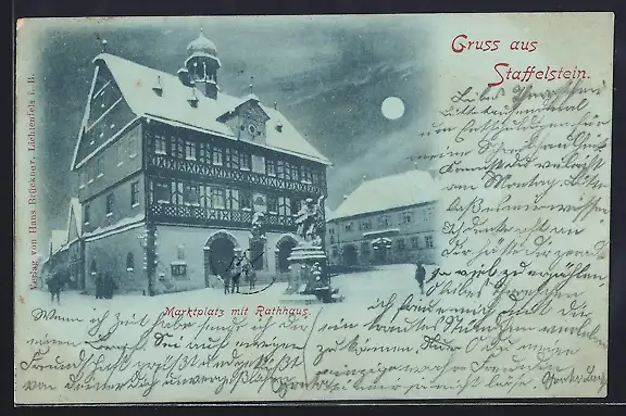 Mondschein-AK Staffelstein / Mainthal, Marktplatz mit Rathaus im Winter