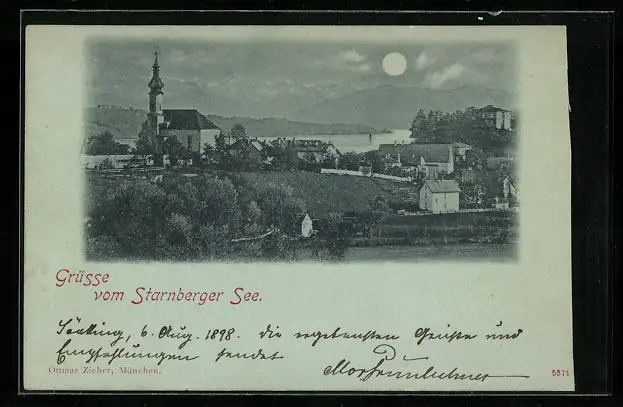 Mondschein-AK Starnberg, Starnberger See mit Kirche