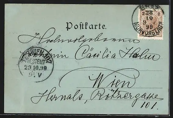 alte Ansichtskarte, gelaufen 1899, Einriss li. oben, Stempelspur, Bugspur re. unten, guter Zustand