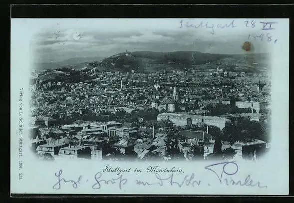 Mondschein-AK Stuttgart, Totalansicht im Mondlicht