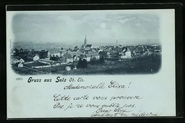 Mondschein-AK Sulz Ob. Els., Gesamtansicht mit vorgelagerten Gärten