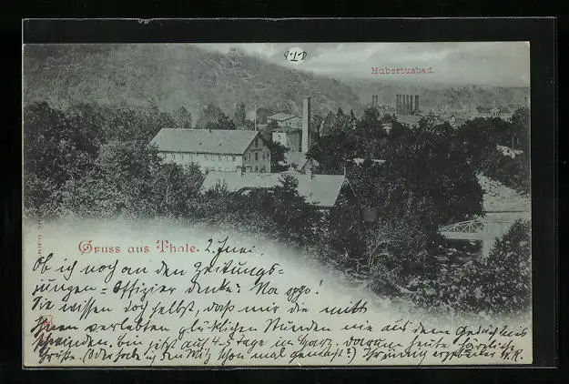 Mondschein-AK Thale, Panorama mit dem Hubertusbad