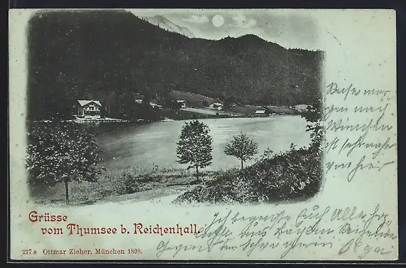 Mondschein-AK Thumsee b. Reichenhall, Uferpartie mit Bergpanorama