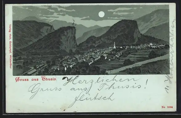 Mondschein-AK Thusis, Ortsansicht mit Bergpanorama