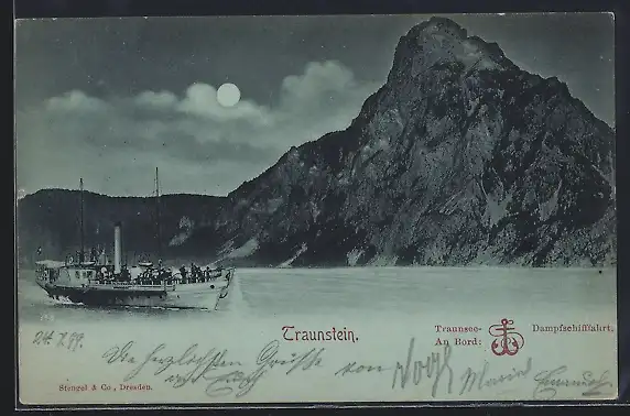 Mondschein-AK Traunstein, Dampfer in Fahrt